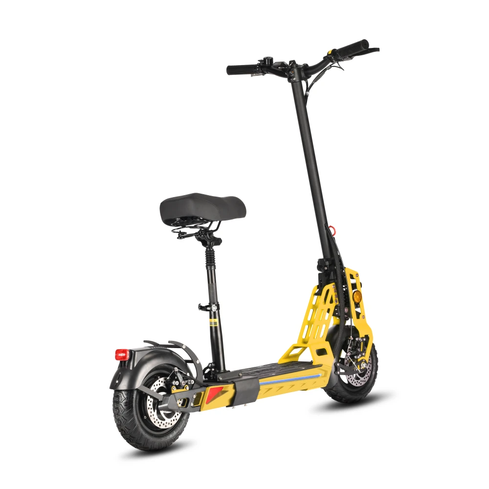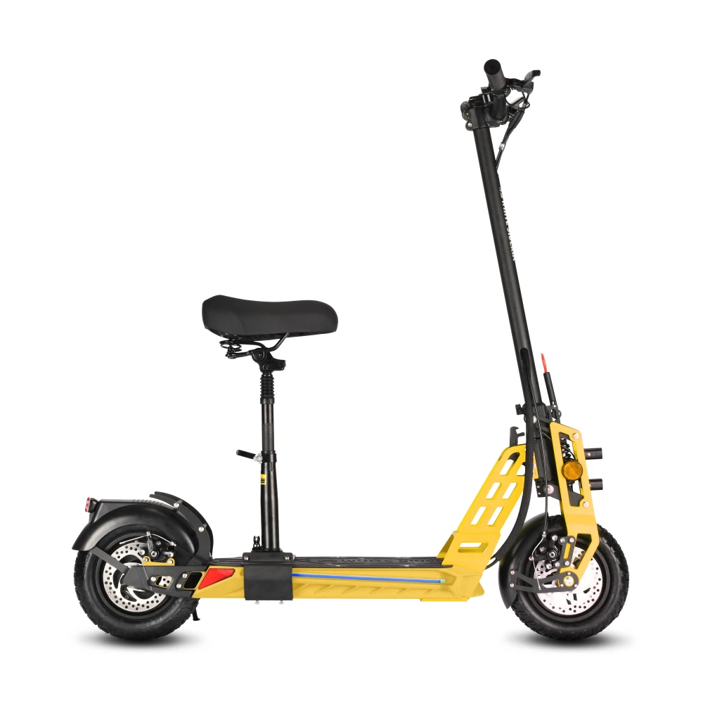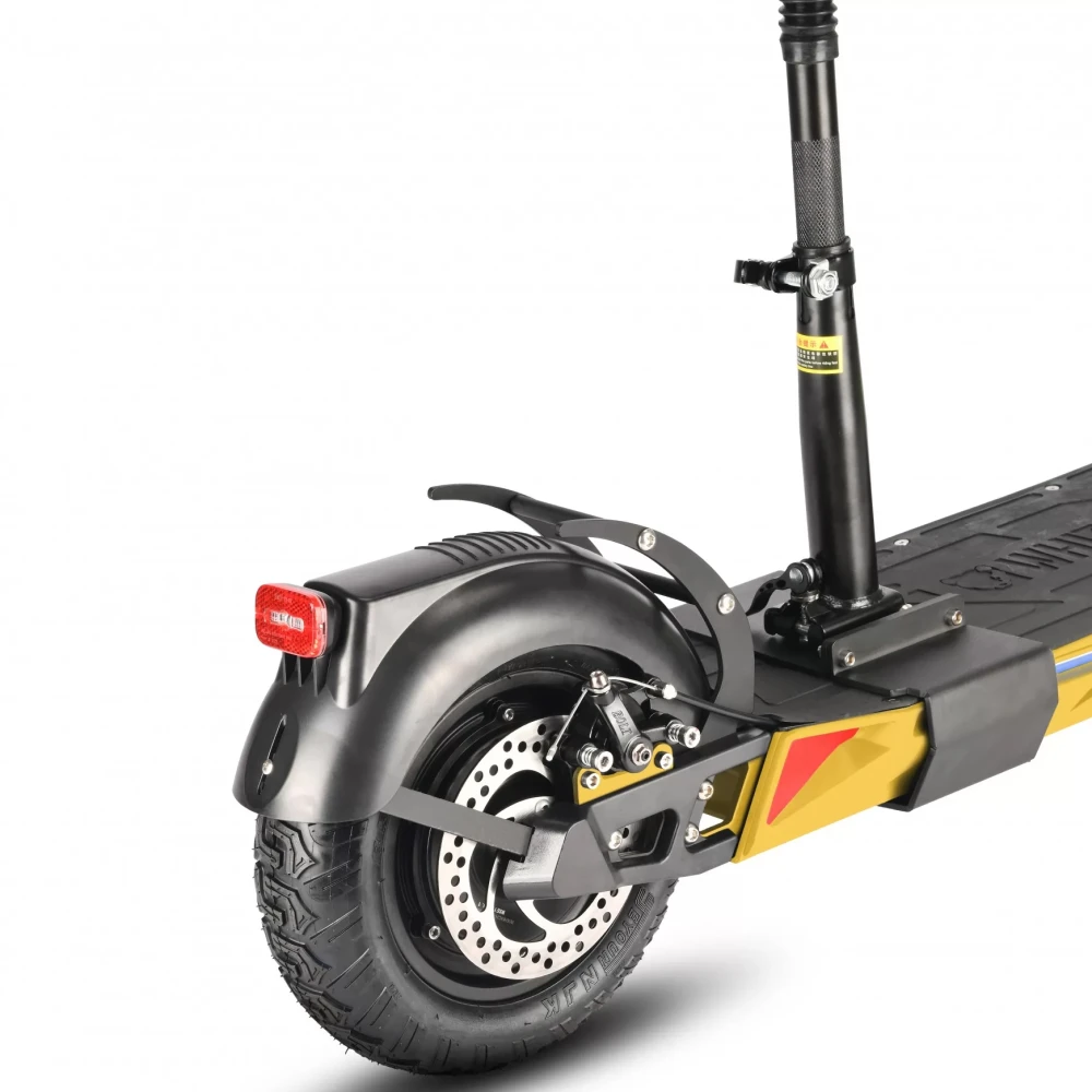 Большие колеса 11 дюймов изготовлены из резины и имеют надувную конструкцию. Широкий протектор обеспечивает лучшее сцепление с дорожным полотном. Амортизация доведена до совершенства и позволяет не замечать ямы и кочки. Широкое сидение рассчитано на длительные поездки. Яркий передний свет и оригинальные габаритные огни делают поездки безопасными. Тормоза дисковые имеют независимы друг от друга на каждом колесе и хорошо реагируют на команды. Современный боровой компьютер отображает основные параметры электросамоката, такие как скорость и уровень заряда.