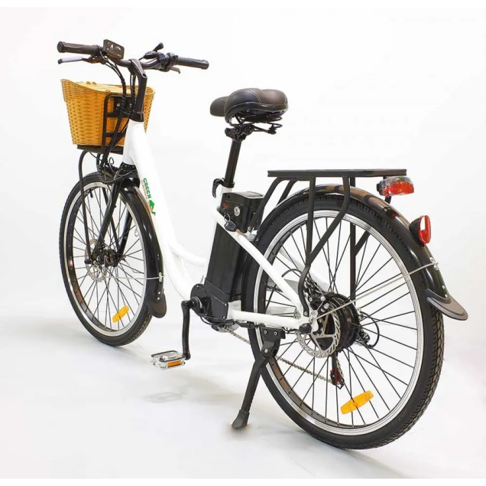 Электровелосипед GreenCamel Бриз (R26 350W 36V 10Ah) Алюм, 6скор – облегченная модель техники весов 22 кг и грузоподъемностью в 110 кг стала хитом продаж наступившего сезона. Первое ознакомление с моделью заявляет, что она создана для слабого пола. Объемная удобная для продуктов корзина, классический белый тон привлекают любителе комфорта и удобства. На самом деле электровелосипед рассчитан на женскую и мужскую категорию. Подтверждением тому являются совершенствованные технические характеристики.