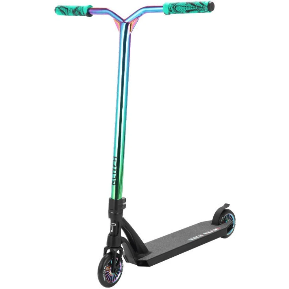GLITCH 2020 – это очередная новинка 2020 года от производителя Tech Team. Модель уже стала популярна, благодаря своему парковому стилю катания. При покупке самокат упаковывают в прочную коробку, на которой есть информация о производителе и краткая характеристика. Самокат упакован в разобранном виде, но для сборки в коробке присутствует инструкция и ключ для закручивания болтов. Самокат произведен в двух цветах – серебристо – черный и черно-хромированный. На руле самоката установлены грипсы средней мягкости. Габариты стандартные – 60 см на  58 см. На руле установлен зажим на 2 болта. Вилка самоката фрезерованная из алюминиевого сплава. Связывает все детали система компрессора HIC. Колеса 110 размера, лучевые. Над задним колесом установлен гибкий и стальной тормоз. Под декой нарисовано граффити с названием модели. Сама дека практически идеальной прямоугольной формы. В собранном состоянии самокат высотой 77 см и весом 3,9 кг. Самокат подойдет для райдера ростом от 140 см до 175 см.